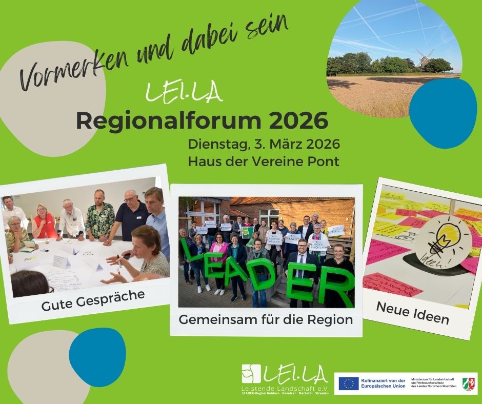 Veranstaltung Gutes entsteht dort, wo Menschen sich begegnen Ganz herzlich laden wir zum „Lei.La“-Regionalforum 2026 am Dienstag, 3. Juli 2026 um 18:00 Uhr ins Haus der Vereine nach Geldern Pont. ...